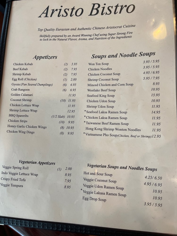 “ Finally...I have passed Aristo Bistro many times, we finally ordered take out and decided to eat in. Glad we did. Growing up in what is now referred to Cleveland's Asia Town, Aristo Bistro is authentic, fresh and delicious. The owner, Anthony, a long time Cleveland restaurant owner made his way to the west side and I love it. Not to mention my favorite waiter, Alex, works there too. This time around I opted for comfort food, keeping it simple with egg drop soup, pan fried noodles and Mongolian tofu. Everything was delicious, full of flavor, and so fresh. They also offer beer and wine. I cannot wait to keep going back. ”